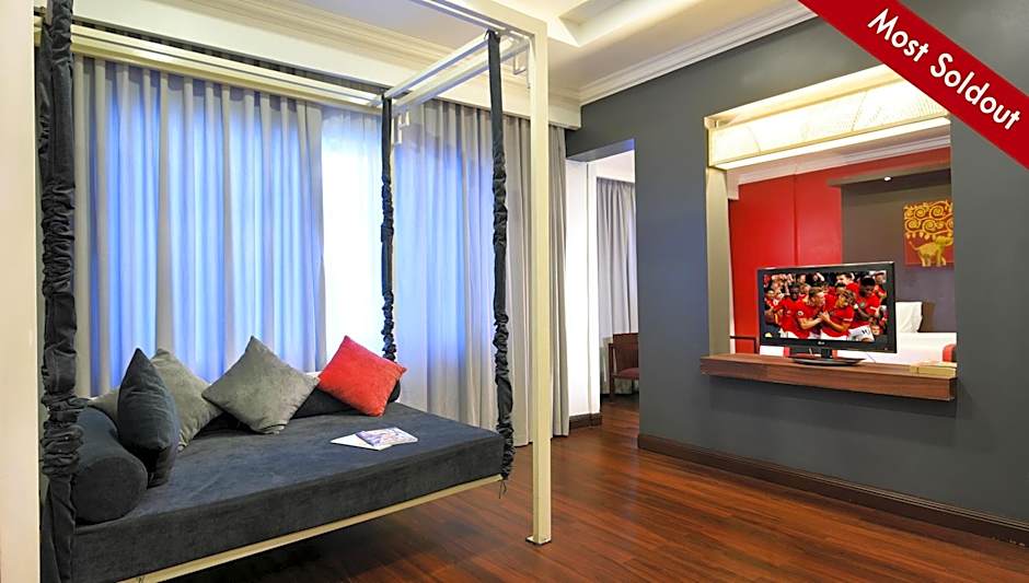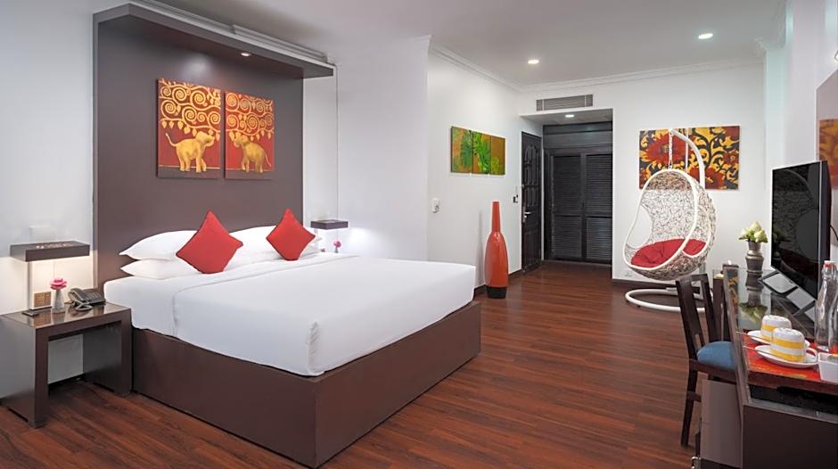A stylish and spacious Zen-decorated suite for 2 guests is available. The room is equipped with a hammock swing and a flat-screen TV. Additionally, a dining table and a laptop-sized personal safe are provided. The private bathroom features double sinks, a standing shower, and a separate bathtub. This room type is recommended for leisure, work, or travel to celebrate a special occasion. After a day of touring, guests can relax at the beautiful swimming pool, poolside bar, and other services surrounding the area. The hotel is located in the heart of Siem Reap, near supermarkets, banks, and other convenience stores.